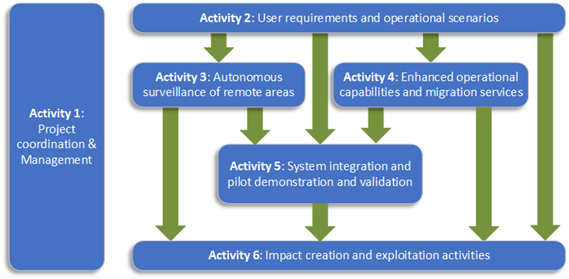 Στο πλαίσιο αυτής της δραστηριότητας, οι τεχνικοί και ακαδημαϊκοί εταίροι θα πραγματοποιήσουν όλες τις σχετικές υπο-δραστηριότητες με στόχο τη δυνατότητα αυτόνομης επιτήρησης απομακρυσμένων συνοριακών περιοχών μέσω UxV. Ο στόχος είναι η προσαρμογή εξοπλισμού και εργαλείων, όπως UxV και αισθητήρες, λογισμικό σχεδιασμού αποστολών και βέλτιστης κατανομής πόρων, για την ειδική αποστολή της αυτόνομης επιτήρησης των συνόρων. Αυτό θα επιτρέψει στη λειτουργική μονάδα του συστήματος να κατευθύνει βέλτιστα τους διαθέσιμους πόρους UxV σε απομακρυσμένες συνοριακές περιοχές όπου υπάρχει υψηλή πιθανότητα παράτυπων μεταναστευτικών δραστηριοτήτων και όπου η κανονική επιτήρηση είναι δύσκολη. Επιπλέον, αυτή η δραστηριότητα θα διασφαλίσει την κατάλληλη προμήθεια εξοπλισμού και την ενσωμάτωσή του με τα εργαλεία λογισμικού.